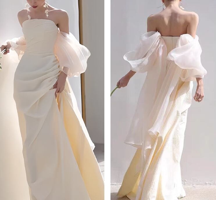 ▪大人可愛い印象を与える肩出しワンピースです。フレアAラインのロングスカートデザインが、優雅さを引き立て、ハイウエストが美しいシルエットを作ります。シンプルながらもおしゃれで、フェミニンな雰囲気を演出する一着です。結婚式やイベントなど特別なシーンにぴったりで、インスタ映えも狙えます!