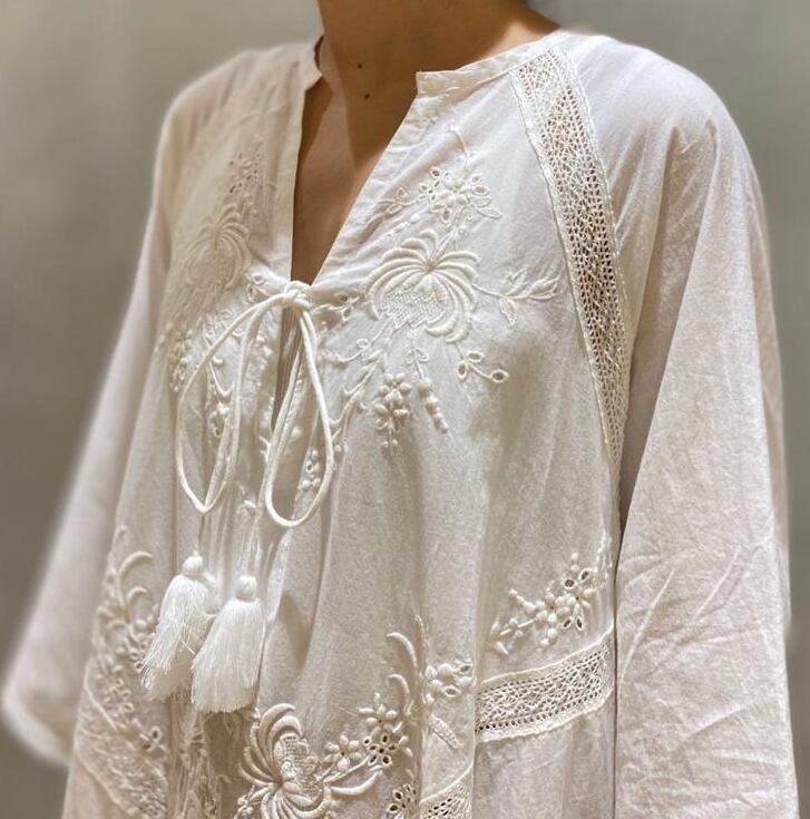 ▪こちらのワンピースは、Vネックと長袖のデザインが特徴で、ロングスカートのフレアが女性らしさを引き立てる一着です。胸元のリボンと刺繍が、シンプルながらも華やかさをプラスし、カジュアルからフォーマルなシーンまで幅広く対応可能です。