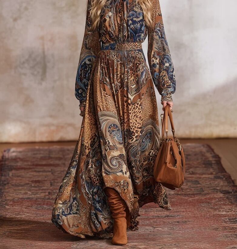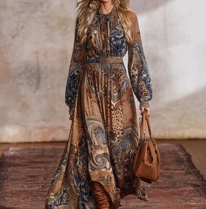 ▪このワンピースは、ロング丈とランタンスリーブが魅力的な一着。ハイウエストデザインがスタイルをすっきり見せ、フレアのAラインが女性らしさを引き立てます。レトロプリント柄が、シックな色でありながらも存在感を放ち、どんなシーンへのお出かけにもぴったりです。