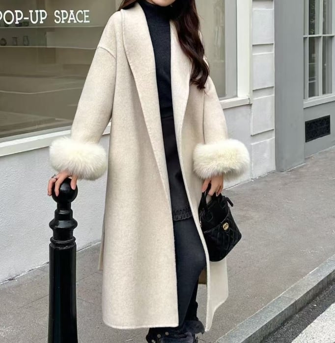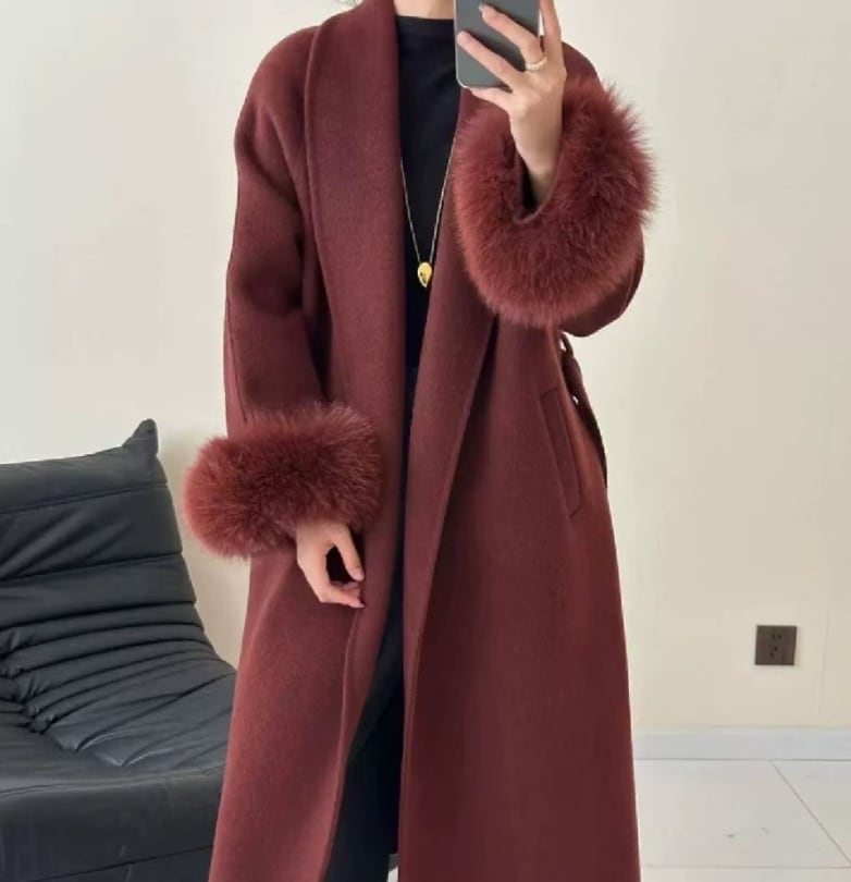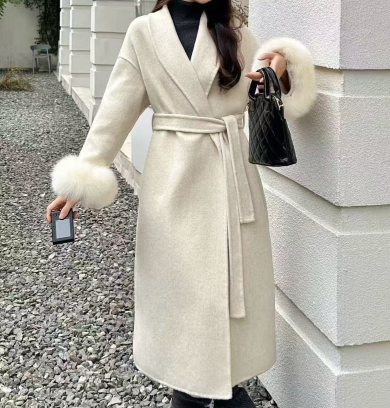 ▪暖かさとおしゃれを兼ね備えたアウターコート。前開きデザインとウエストのベルトでスタイルアップ効果を実感。冬の季節にぴったりな厚手ウール素材にファー使いで、シンプルながらも存在感を放つ一着です。お出かけやオフィスカジュアル、デイリーユースに最適!
