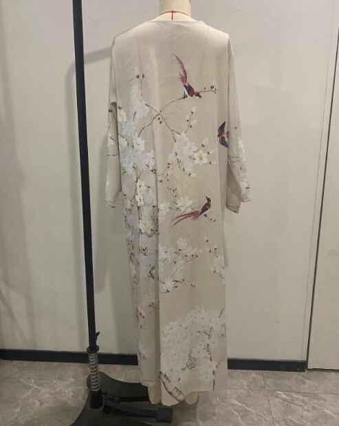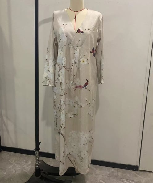 Vネックが抜け感を演出し、ロング丈が優雅に揺れる一着