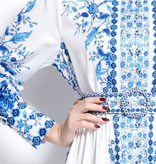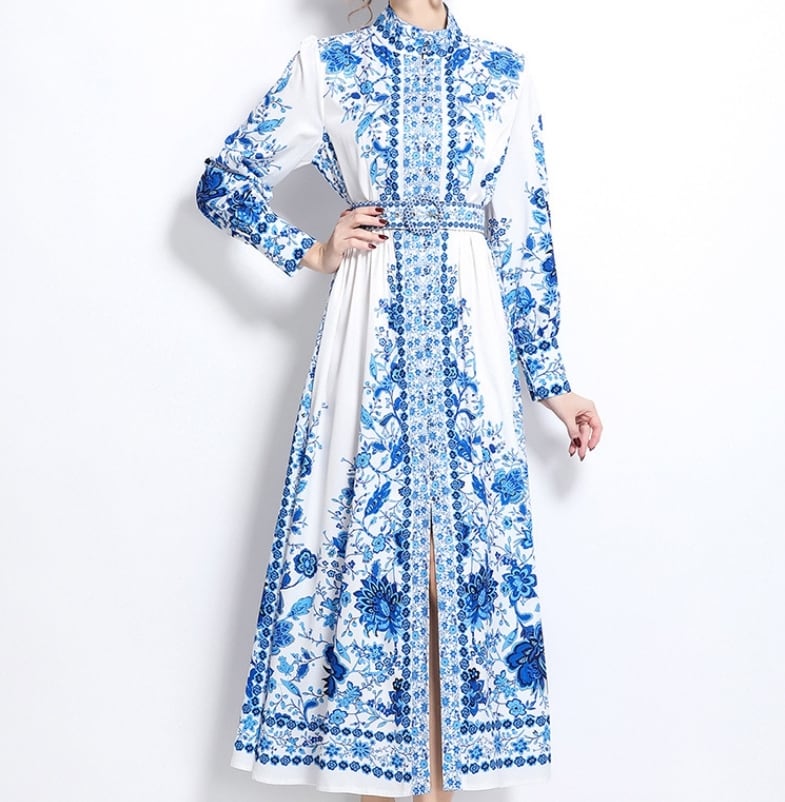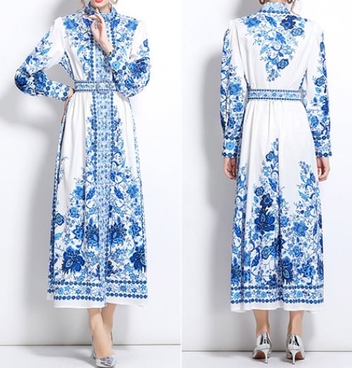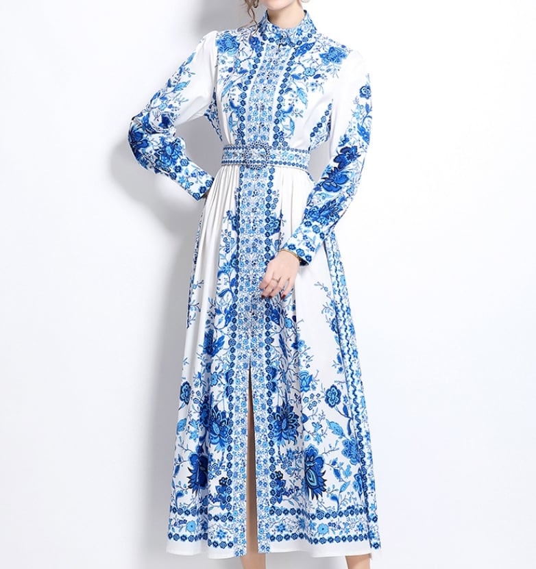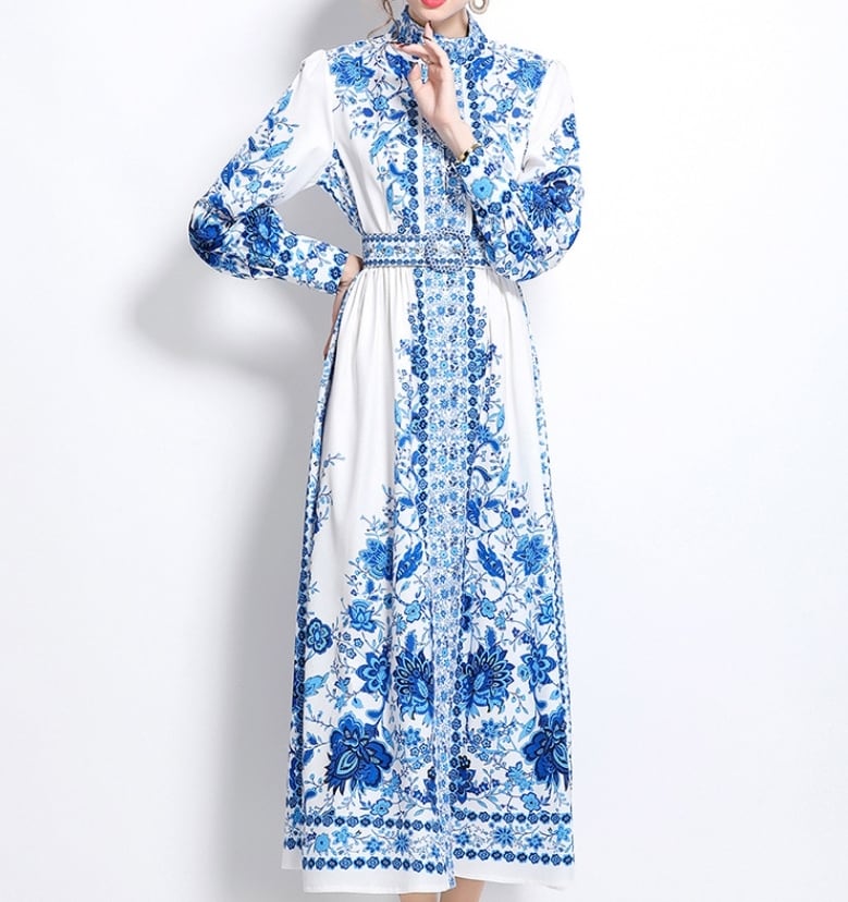 【送料無料】 ワンピース ワンピドレス ハイネック 長袖 ハイウエスト ウエストベルト スタイルアップ ブルーフラワープリント柄 ロング丈 フレアスカート スリット Aライン ポリエステル きれいめ カジュアル エレガント 大人可愛い おしゃれ 存在感 フェミニン ガーリー 欧米風 人気トレンド 新作 春 夏 20代 30代 40代 お出かけ イベント 旅行 リゾート デート ママ インスタ映え 70394