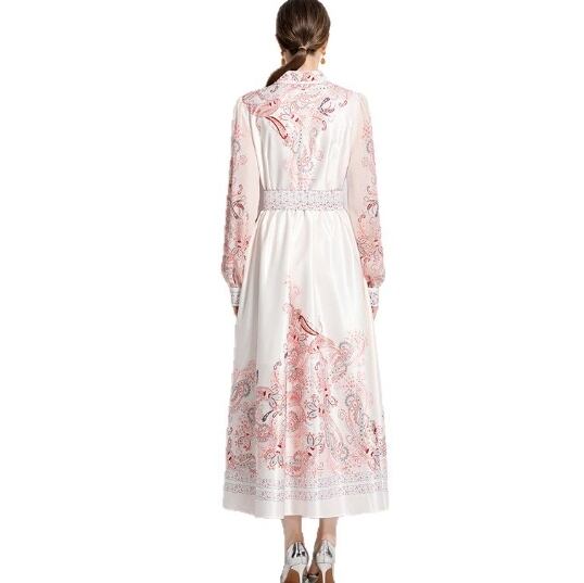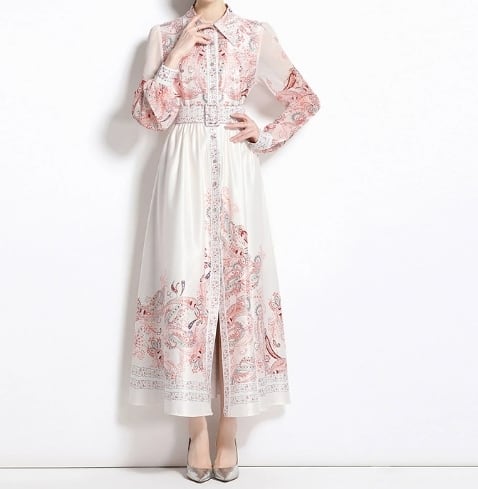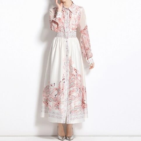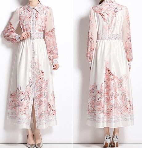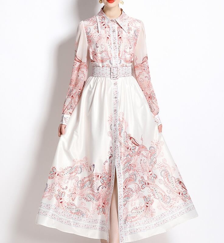【送料無料】 ワンピース ワンピドレス 襟付き 長袖 バブルスリーブ ハイウエスト ウエストベルト スタイルアップ フラワープリント柄 ロング丈 フレアスカート スリット Aライン ボタン ポリエステル きれいめ カジュアル エレガント 大人可愛い おしゃれ 存在感 フェミニン ガーリー 欧米風 人気トレンド 新作 春 夏 20代 30代 40代 お出かけ イベント 旅行 リゾート デート ママ 通勤 通学インスタ映え 70395