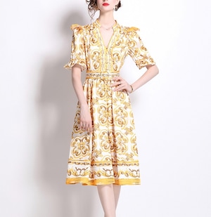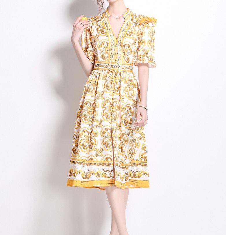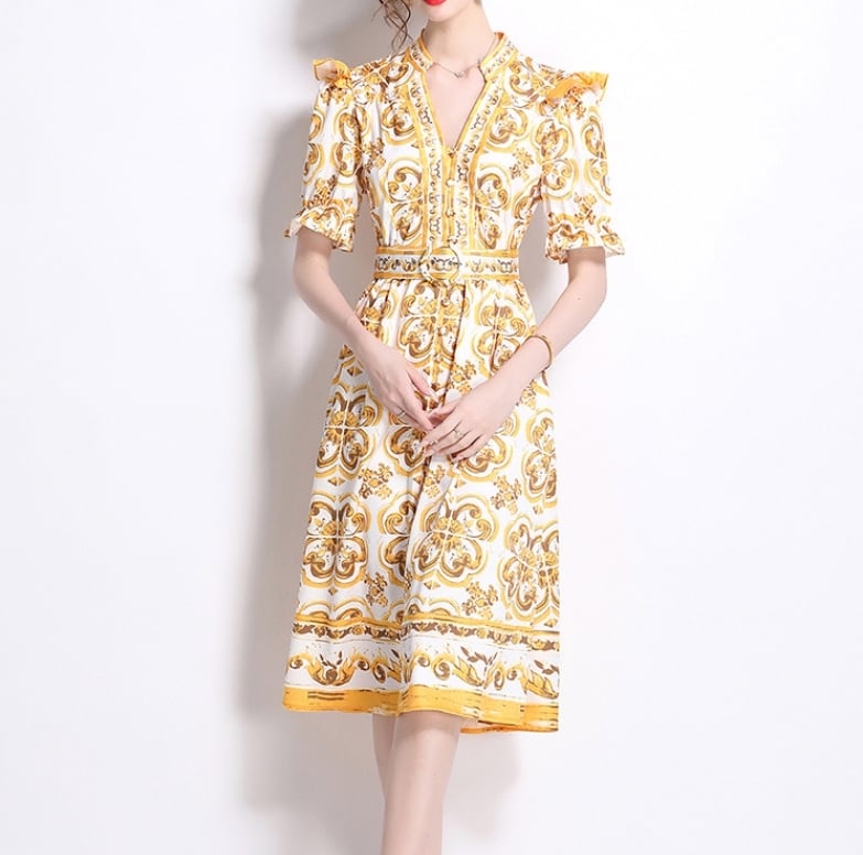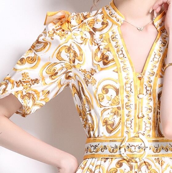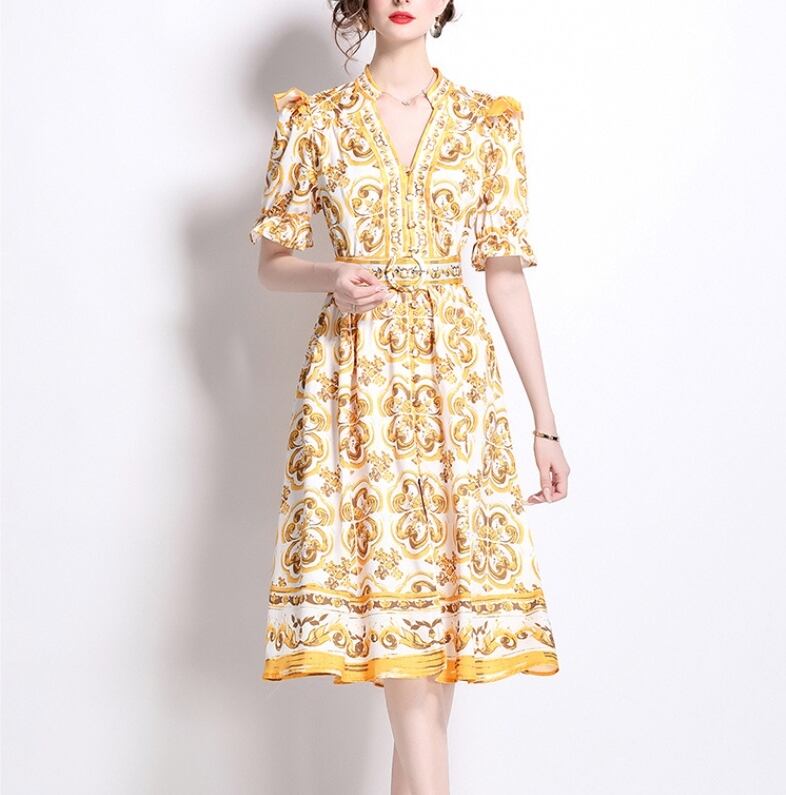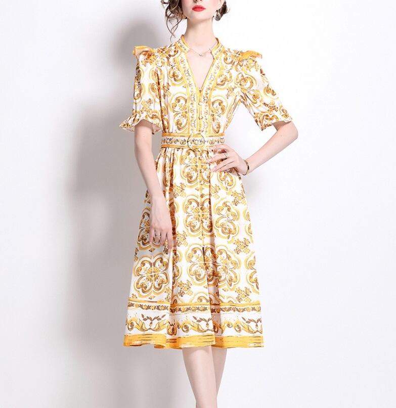 途中【送料無料】 ワンピース ワンピドレス Vネック 半袖 バブルスリーブ ハイウエスト ウエストベルト スタイルアップ プリント柄 膝丈 フレアスカート スリット Aライン ボタン ポリエステル きれいめ カジュアル エレガント 大人可愛い おしゃれ 存在感 フェミニン ガーリー 欧米風 人気トレンド 新作 春 夏 20代 30代 40代 お出かけ イベント 旅行 リゾート デート ママ 通勤 通学インスタ映え 70395