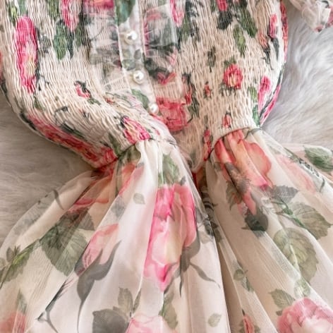 レトロな花柄とスクエアネックが、やさしく上品な印象を引き立てるワンピース
