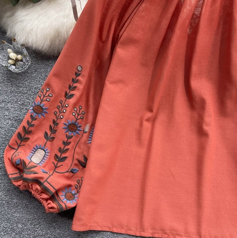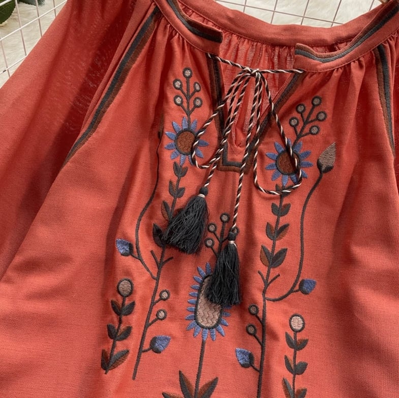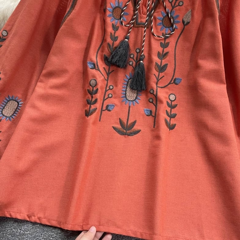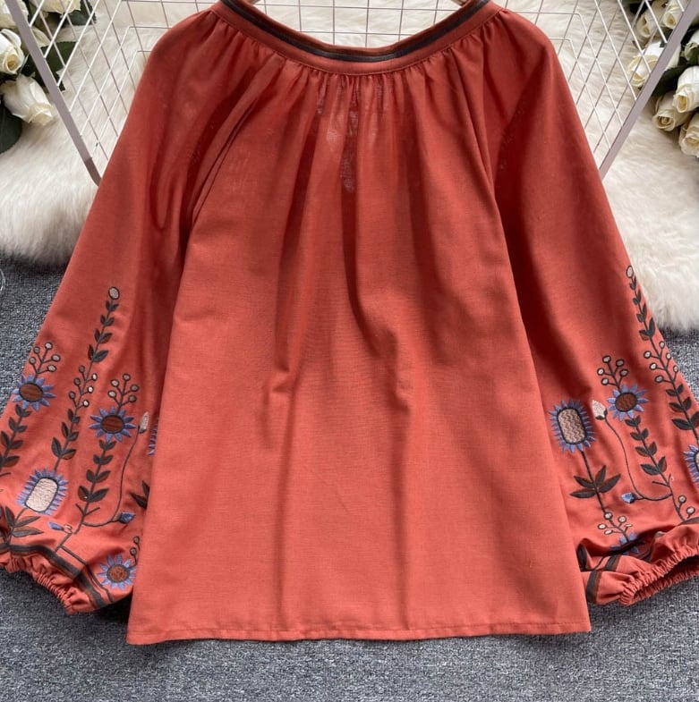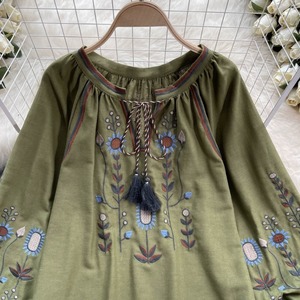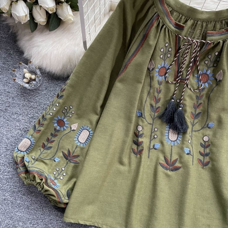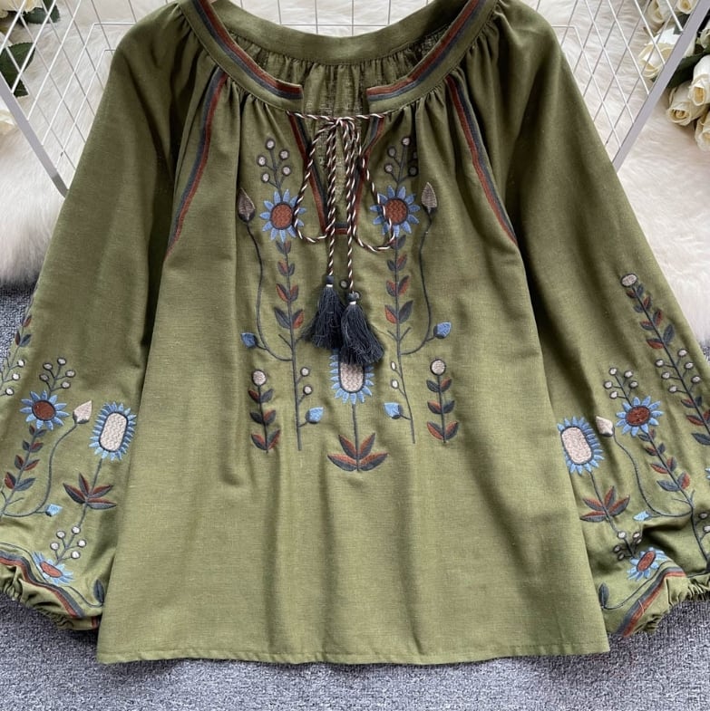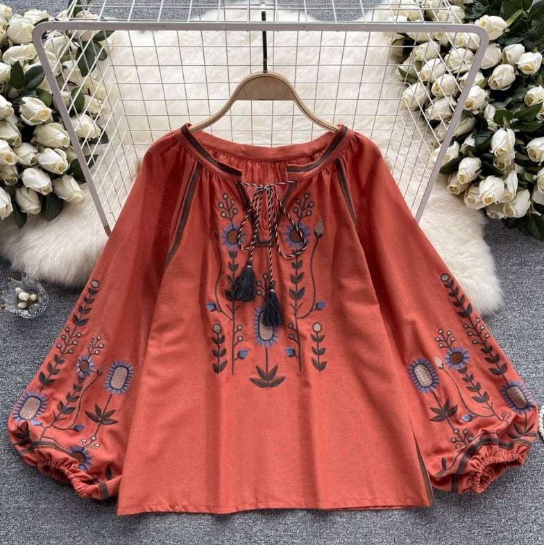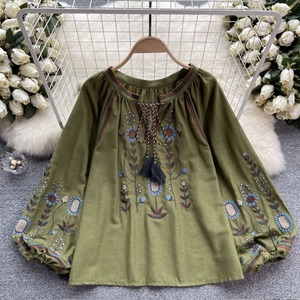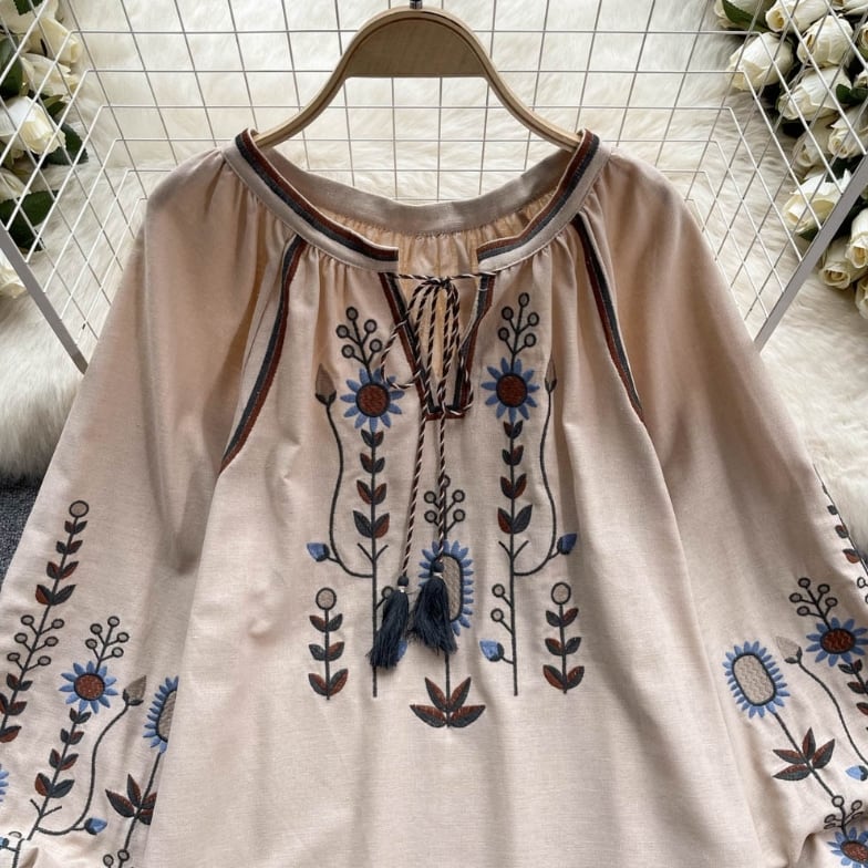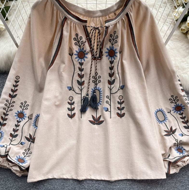 【送料無料】 トップス シャツ 長袖 ランタンスリーブ 胸元紐リボン 刺繍 ボヘミアン風 ヴィンテージ ゆったり きれいめ カジュアル エレガント 大人可愛い おしゃれ 存在感 フェミニン ガーリー フレンチシック 人気トレンド 新作 春 夏 20代 30代 40代 お出かけ 部屋着 イベント 旅行 リゾート デイリー インスタ映え 70400