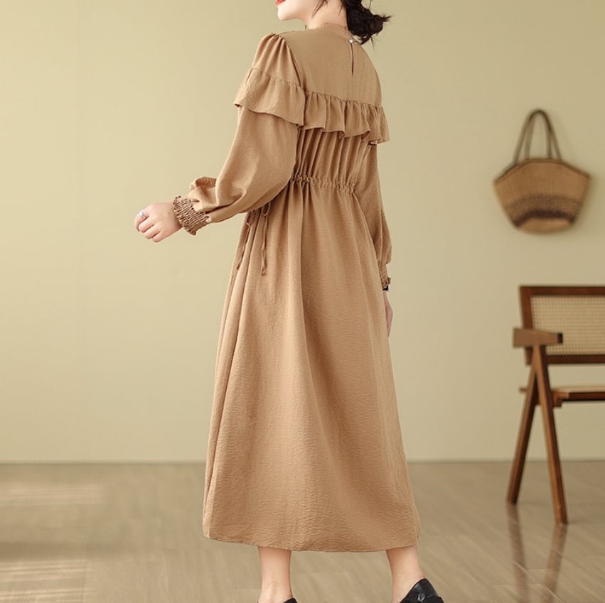 ▪この新作ワンピースは、タートルネックデザインで、フライスリーブの長袖がエレガントな印象を与えます。ロングスカートのフレアAラインが動くたびに美しいシルエットを作り上げます。