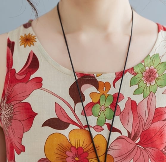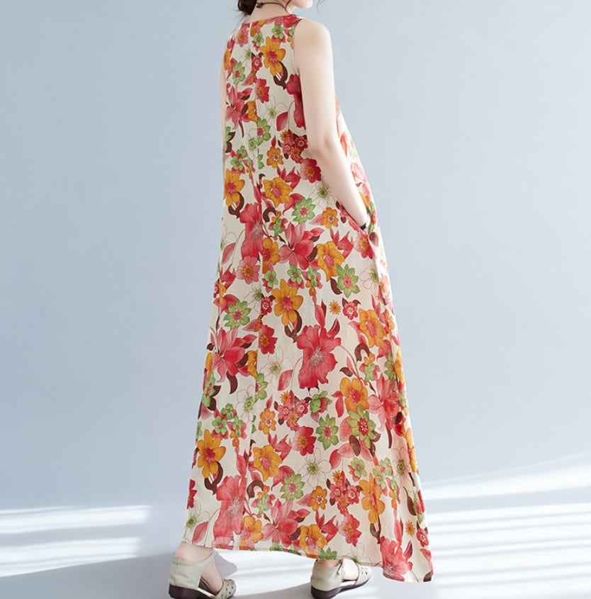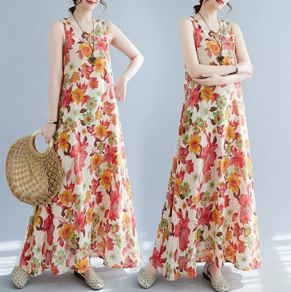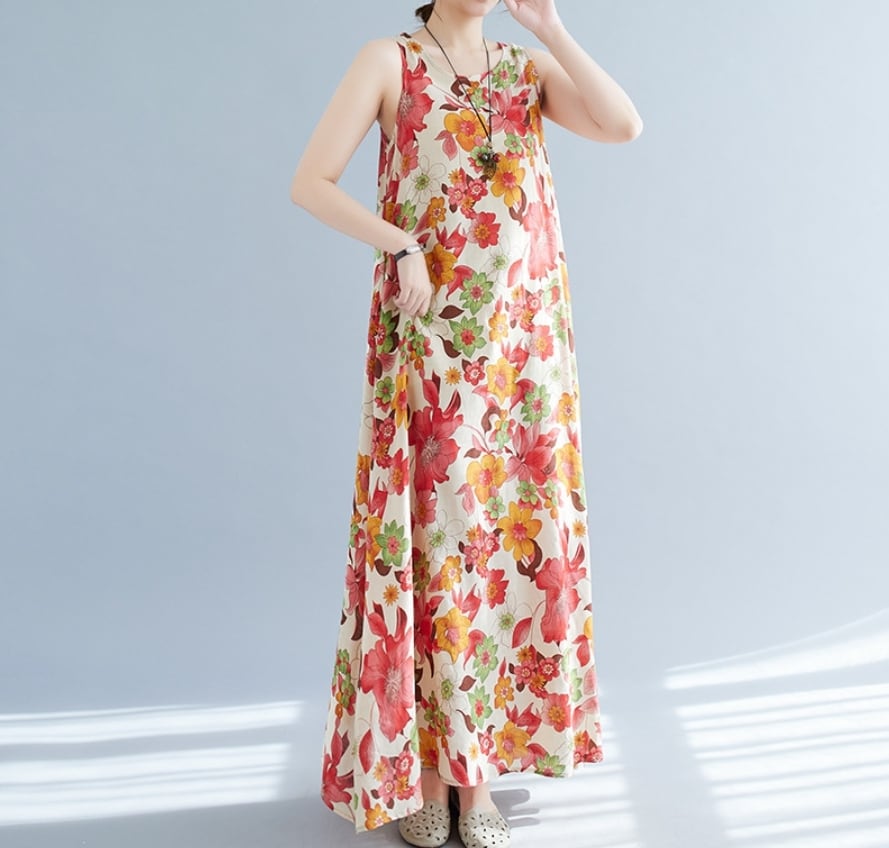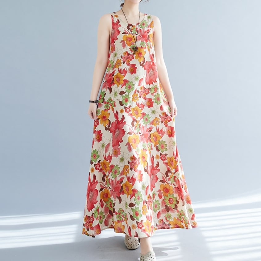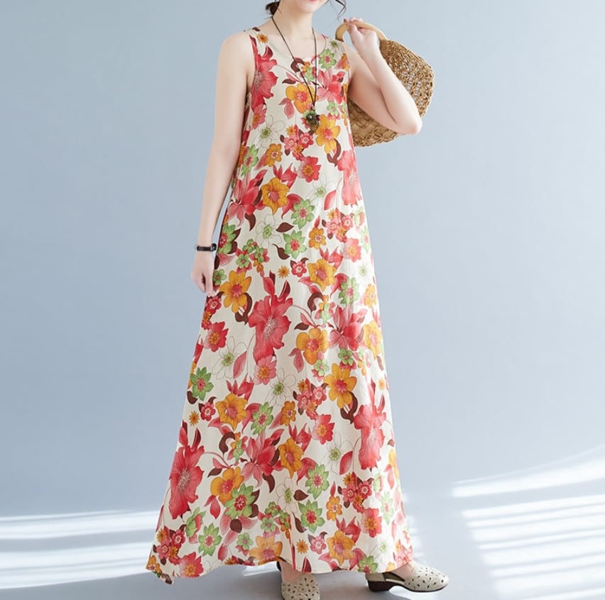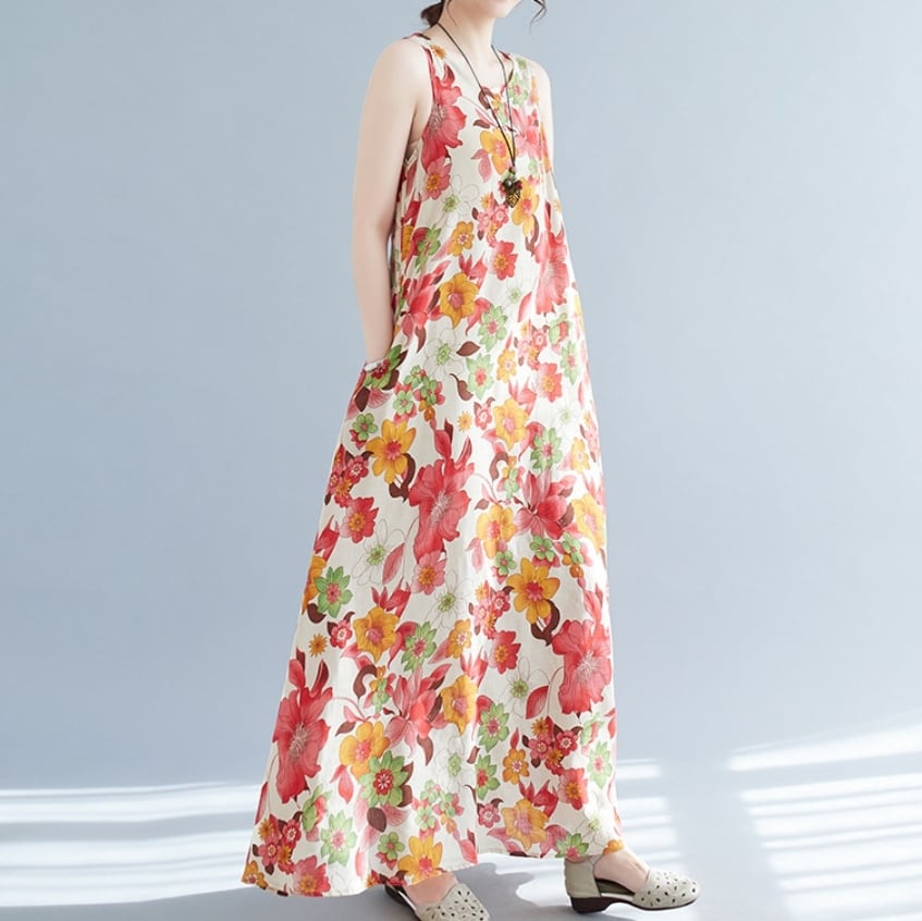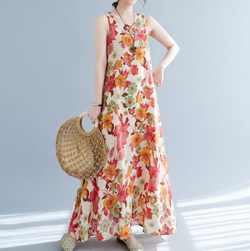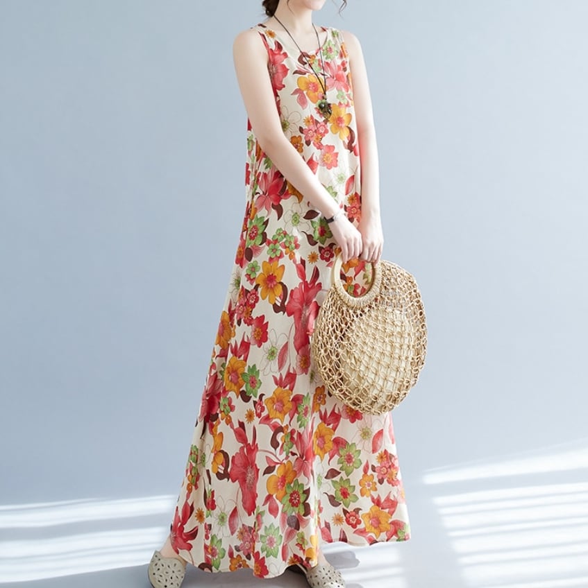 【送料無料】 ワンピース ワンピドレス ラウンドネック ノースリーブ ロングスカート ストレート フレア Aライン 花柄 麻 リネン 綿 コットン ゆったり きれいめ カジュアル エレガント 大人可愛い おしゃれ 存在感 フェミニン ガーリー 韓国風 オルチャン 人気 トレンド 新作 夏 10代 20代 30代 40代 お出かけ 通勤 通学 イベント 旅行 リゾート ママ デイリー 普段着 インスタ映え 70420