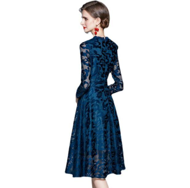ワンピース ドレス 総 レース 3020 ひざ 丈 七分袖 レディース メッシュ 刺繡 S M L XL 2XL ブルー 結婚式 二次会 お呼ばれ パーティー等 カジュアル 生地 光沢 綺麗 お洒落 シースルー 送料無料
