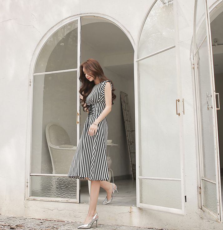 ストライプ ノースリーブ ワンピース 3024 Aライン 編み上げ 膝丈 パーティー クラブ ドレス レディース サマードレス クール 気品 パーティードレス エレガント 白 黒 モノトーン 高級感 スタイリッシュ フェミニン カジュアル お呼ばれ S M L 送料無料