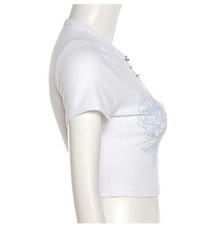 トップス 女子 レトロプリント 3038 半袖 Tシャツ 女性 デザイン Vネック 薄 ハイウエスト 露出 送料無料