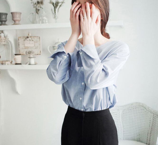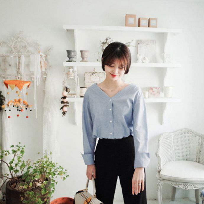 前後V襟のブラウス。パンツスタイルにも、スカートに合わせても爽やかなイメージを醸し出してくれます。秋口のおしゃれに一役買ってくれそうですね。