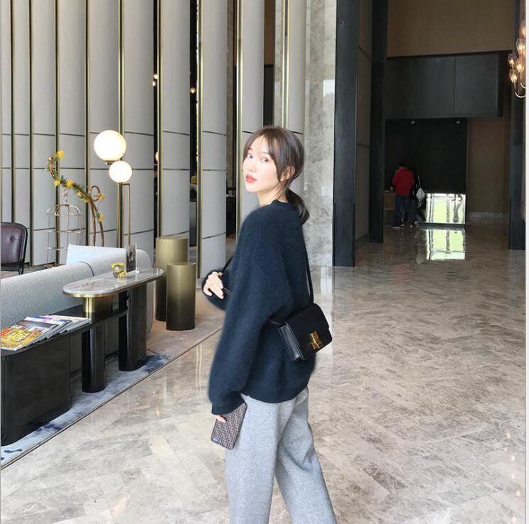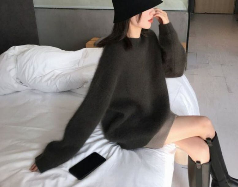 秋冬の新作モヘアセーター。ゆったりとした腰が少し隠れるくらいの着丈です。首回りに沿ったハーフタートルネックなので、すっきり着こなせます。
