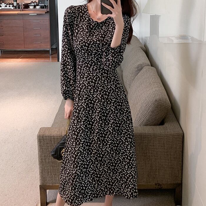 小花柄ワンピース ワンピース 5317 フレアワンピース 膝丈 ひざ丈 膝下 袖あり 長袖 ラウンドネック シフォン かわいい 大人可愛い きれいめ シンプル カジュアル 大人 おしゃれ お洒落 レトロ 大人可愛い 大人女子 こなれ感 ラブリー キュート ガーリー 個性的 主役級 存在感 柄 花柄 小花柄 春 夏 秋 10代 20代 30代 レディース 学生 通学 デート お出かけ 公園デビュー 女子会 休日 着回し 普段使い 重ね着 韓国 韓国系 サイズ S M L XL ブラック ブラウン 送料無料