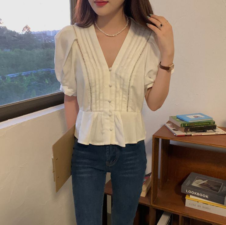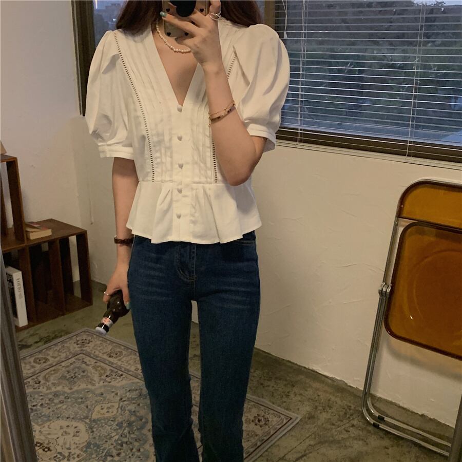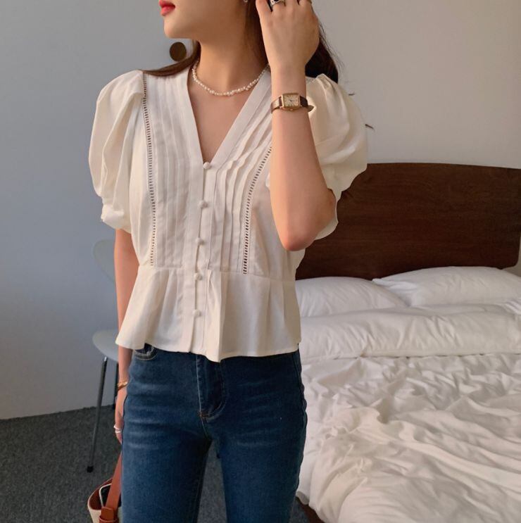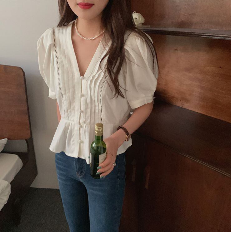 トップス シャツ ショート丈 20038 袖あり 半袖 パフスリーブ Vネック 襟付き セミフレア フリル 薄手 かわいい 大人可愛い シンプル カジュアル おしゃれ レトロ エスニック 大人可愛い 大人女子 キュート ガーリー 無地 春 夏 2021 20代 30代 レディース デート お出かけ 女子会 休日 イベント リゾート 旅行 ガーデン 着回し 普段使い オルチャン ファッション モテ 新作 フリーサイズ 色展開 ホワイト グリーン 送料無料