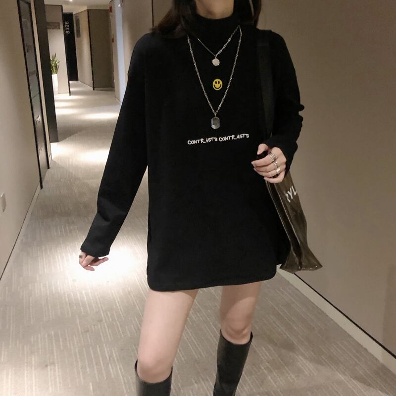 ハイネック長袖ロゴトップス トップス 5418 Tシャツ トレーナー ロング ロング丈 袖あり 長袖 ハイネック 綿 かわいい 大人可愛い シンプル カジュアル 大人 おしゃれ お洒落 大人可愛い 大人女子 こなれ感 メンズライク ボーイッシュ スポーティー 個性的 クール 存在感 無地 春 秋 10代 20代 30代 レディース 学生 通学 デート お出かけ 公園デビュー 女子会 休日 着回し 普段使い 韓国 韓国系 サイズ S M L XL 色展開 白 ホワイト 黒 ブラック 送料無料