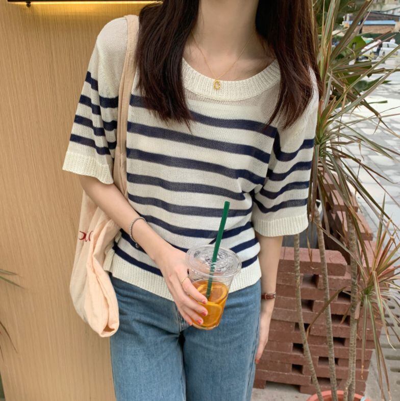 トップス ニットソー ショート丈 袖あり 20085 半袖 ラウンドネック 襟付き ストレート サマーニット 薄手 かわいい 大人可愛い シンプル カジュアル おしゃれ 大人可愛い ラフ ガーリー ルーズ ボーダー 春 夏 10代 20代 レディース 学生 デート お出かけ 休日 リゾート 旅行 海 プール 着回し 普段使い 韓国系 ファッション 楽ちん 定番 インスタ映え サイズ S M L 色展開 ホワイト ネイビー 送料無料