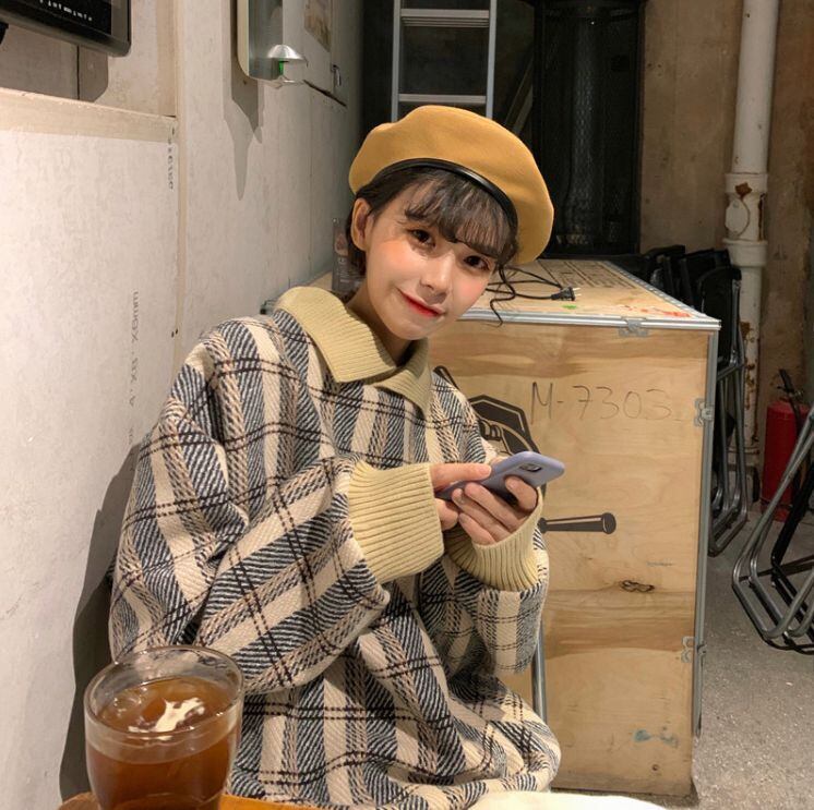 秋 POLO襟 チェック柄 7173 レディース トップス 長袖 プルオーバーフリーサイズ ゆったり ヴィンテージ風 ニット襟 送料無料
