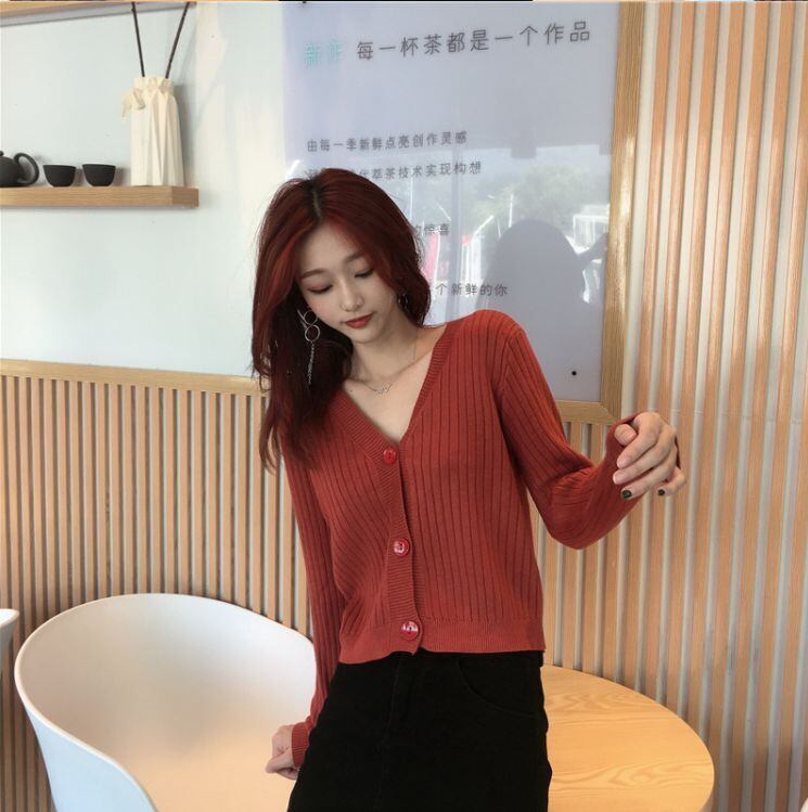 深めのVネックカーディガン。短めの丈でスッキリと着こなせます。