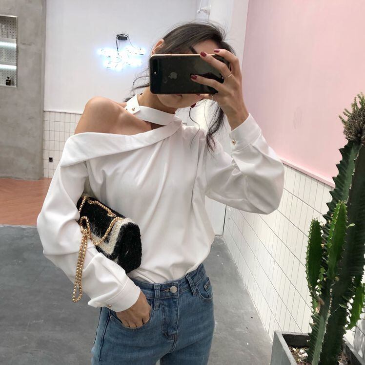 秋の新作 レディース 7208 ワンショルダーカット 小さいサイズ ブラウス 長袖 変わりネック シャツ ソリッドカラー ボトムシャツ 韓国版 シックトップス 送料無料