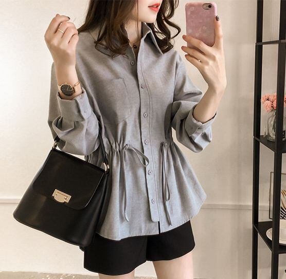 秋口にちょうど良い着心地の、綿麻長袖ブラウス。ウェストシャーリングで、スタイルもスッキリタイトな印象に。