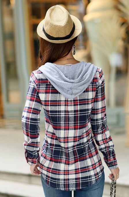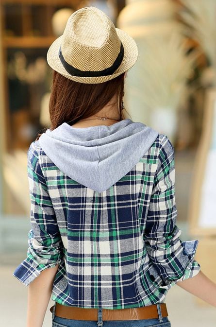 チェック柄のフード付き長袖シャツ。ティーンズにぴったりのカジュアルなシャツです。
