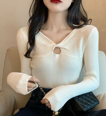 ■暖かな早秋の装いにぴったりなニットトップスが登場しました!Vネックとクロスオーバーデザインが女性らしさを引き立てる一枚です。スリムなシルエットが美しいだけでなく、着るだけで痩せ見えする効果もあります。さらに、長袖トップスなので寒い季節でも暖かさをキープできます。早秋のカジュアルスタイルやママコーデにもぴったりで、アプリコット、ブルー、ホワイト、ブラックの4色からお選びいただけます。