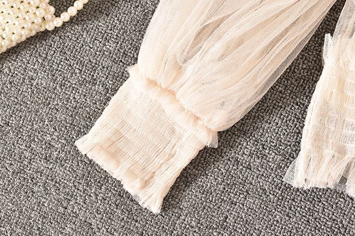 ■シースルーなメッシュレースのブラウス。ふんわり上品な着こなし。アンダースリング、2ピースコンビネーション。
