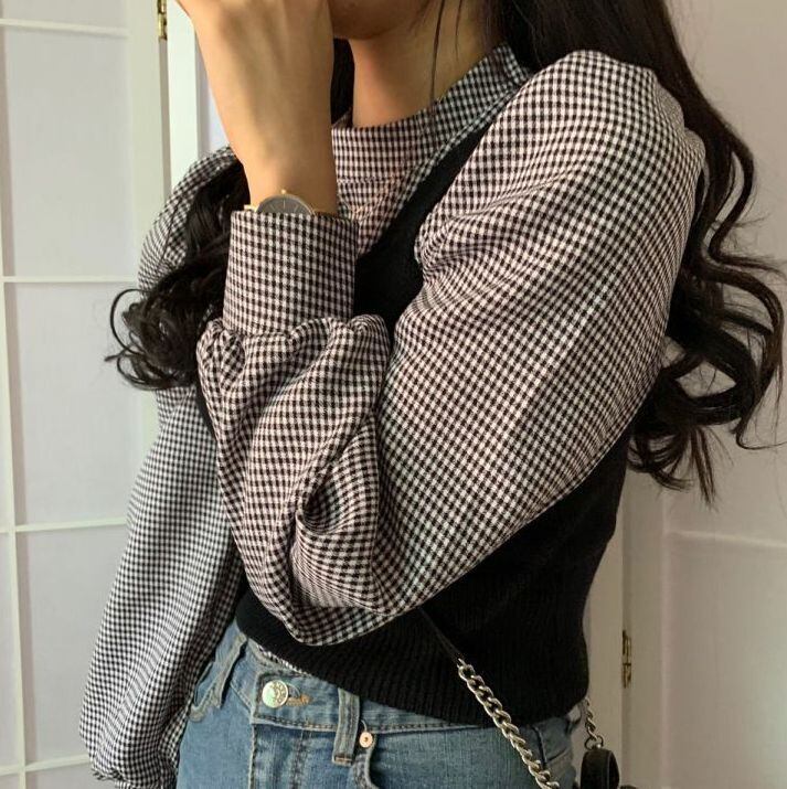 ギンガムチェックブラウス ビスチェ 5332 トップス ブラウス ベスト 袖あり 長袖 パフスリーブ ハイネック 綿 2点セット ツーピース かわいい 大人可愛い きれいめ シンプル カジュアル 大人 上品 おしゃれ お洒落 大人可愛い 大人女子 こなれ感 ラブリー キュート ガーリー 主役級 存在感 無地 柄 チェック柄 春 夏 秋 10代 20代 30代 レディース 学生 通学 デート お出かけ 女子会 休日 着回し 普段使い 重ね着 韓国 韓国系 色展開 黒 ブラック 送料無料