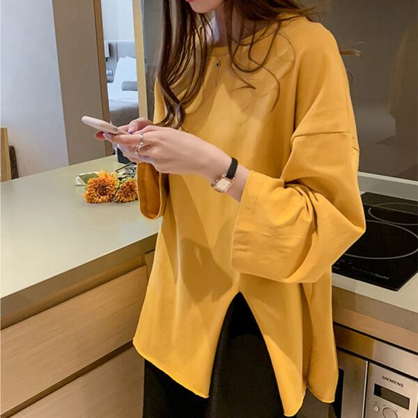 サイドスリットロンT トップス Tシャツ 5421 袖あり 長袖 ラウンドネック スリット サイドスリット 綿 かわいい 大人可愛い シンプル カジュアル おしゃれ お洒落 かっこいい こなれ感 ラフ メンズライク ボーイッシュ ルーズ 個性的 主役級 存在感 無地 春 夏 秋 10代 20代 30代 レディース 学生 通学 デート お出かけ 女子会 休日 着回し 普段使い 重ね着 韓国 韓国系 サイズ XS S M L XL 2XL 色展開 白 ホワイト 黄色 イエロー ピンク 送料無料
