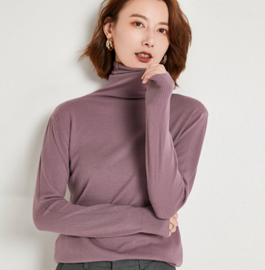 スタンダードなニットセーター。柔らかい手触り、艶やかな風合いのハイネックセーターです。