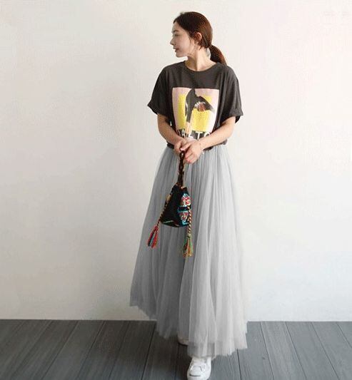 華やかさと繊細さを兼ね備えた女子的素材の、チュールを使用したロングスカート。