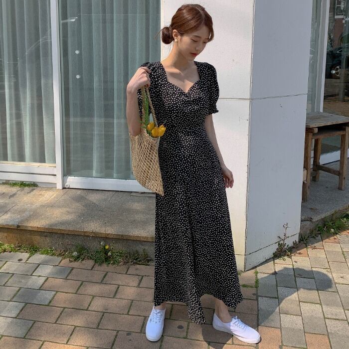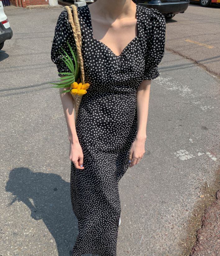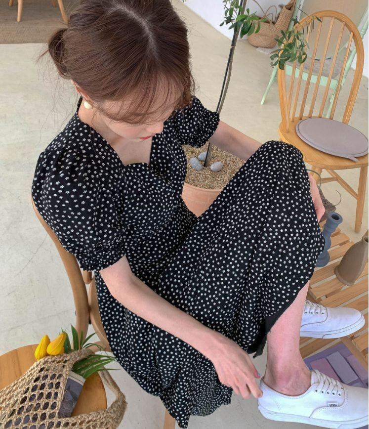 小花柄ロングワンピース ワンピース 5445 フレアワンピース ロング ロング丈 マキシ マキシ丈 袖あり 半袖 パフスリーブ Vネック かわいい 大人可愛い きれいめ シンプル カジュアル 大人 上品 おしゃれ お洒落 大人可愛い 大人女子 ラブリー キュート ガーリー 主役級 存在感 柄 花柄 小花柄 春 夏 10代 20代 30代 レディース 学生 通学 デート お出かけ 女子会 休日 着回し 普段使い 重ね着 韓国 韓国系 サイズ S M L XL 色展開 黒 ブラック 送料無料