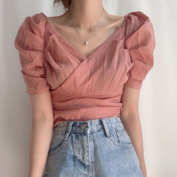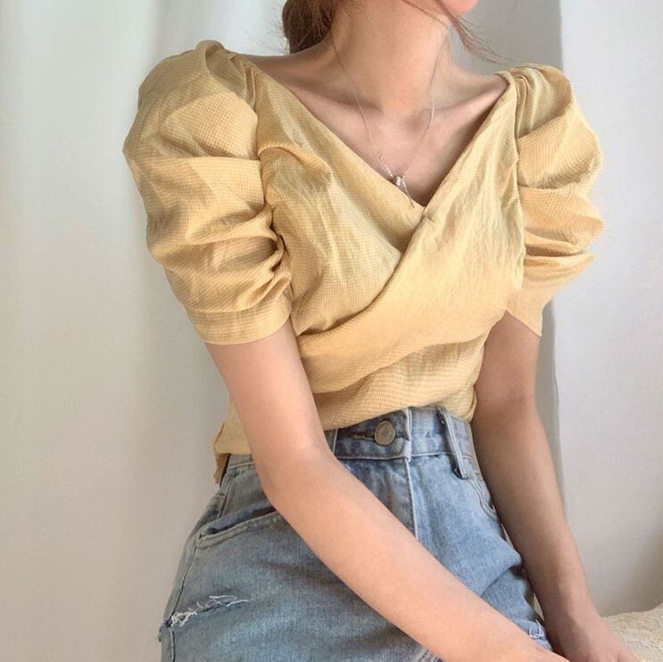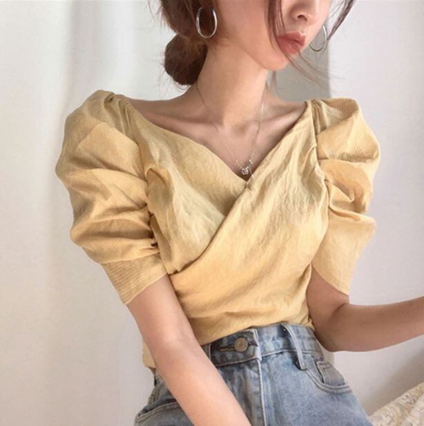 トップス ブラウス ショート丈 袖あり 20234 半袖 パフスリーブ Vネック 襟付き スリム かわいい 大人可愛い きれいめ シンプル 大人 上品 おしゃれ 大人可愛い 大人女子 キュート ガーリー セクシー エレガント 無地 春 夏 10代 20代 レディース デート お出かけ 女子会 休日 パーティー イベント ガーデン 着回し 普段使い 韓国系 ファッション モテ インスタ映え サイズ S M L 色展開 イエロー ピンクベージュ 送料無料