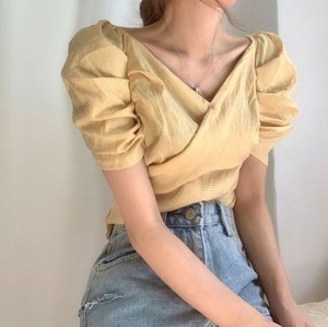 パフスリーブが可愛い、半袖トップスです。胸元がクロスのデザインに絞れていて、綺麗なシルエットを演出します。休日のお出かけから、しっかりおしゃれにきめていきたい時まで、色んなシーンにマッチします。