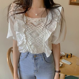 トップス シャツ ショート丈 袖あり 20239 半袖 パフスリーブ スクエアネック 襟付き ストレート 刺繍 フリル 薄手 ナイロン かわいい 大人可愛い きれいめ シンプル 上品 おしゃれ 大人可愛い 大人女子 ラブリー キュート ガーリー 抜け感 花柄 春 夏 2021 デート お出かけ 女子会 休日 イベント リゾート 旅行 ガーデン 着回し 普段使い 韓国系 ファッション モテ 新作 流行 インスタ映え フリーサイズ 色展開 ホワイト アプリコット 送料無料