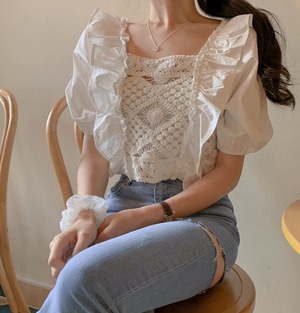 刺繍と大きなフリルがポイントの。半袖シャツです。フェミニンなコーデが好きな方におすすめ!トレンドの小さめバッグとも相性抜群です。