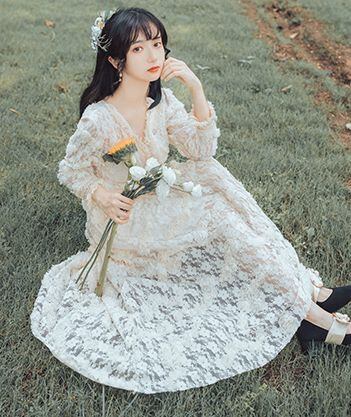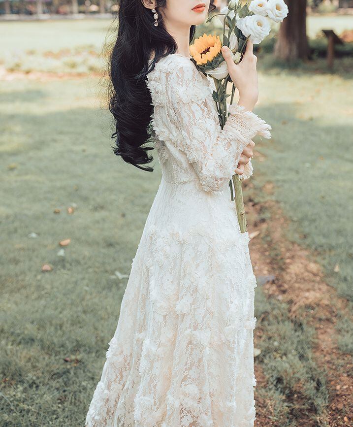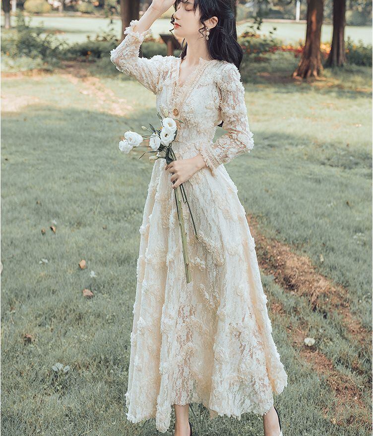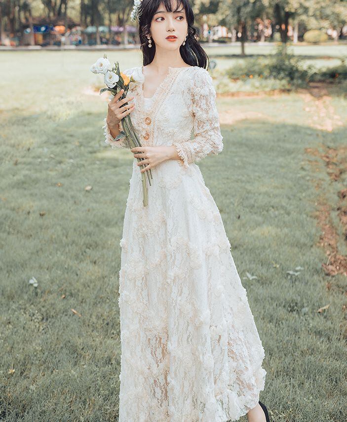 ワンピース ドレス マキシ丈 袖あり 5012 9分袖 Vネック 襟付き Aライン レース 刺繍 ハイウエスト 透け感 薄手 かわいい 大人可愛い きれいめ 上品 おしゃれ 大人可愛い 大人女子 ラブリー キュート エレガント 総レース 春 秋 2020 10代 20代 レディース デート お出かけ 女子会 休日 パーティー イベント ホテル レストラン 着回し モテ 脚長 インスタ映え フレンチスタイル サイズ S M L アプリコットホワイト 送料無料