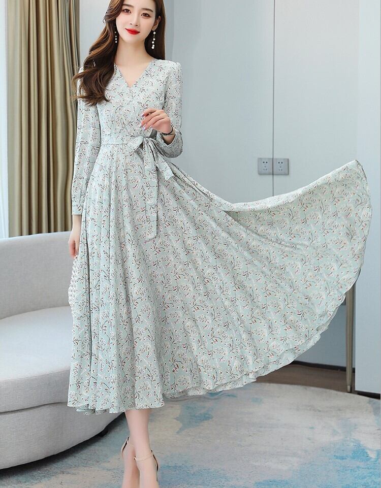 ワンピース ドレス シャツワンピース 5022 ロング丈 袖あり 長袖 Vネック 襟付き Aライン プリーツ シフォン ウエストリボン 大人可愛い きれいめ 大人 上品 おしゃれ 大人可愛い 大人女子 キュート エレガント とろみ感 小花柄 春 秋 2021 20代 30代 レディース デート お出かけ 女子会 休日 パーティー イベント ホテル レストラン 着回し 普段使い 韓国系 ファッション モテ 新作 インスタ映え サイズ S M L XL 2XL 3XL 色展開 グリーン イエロー 送料無料