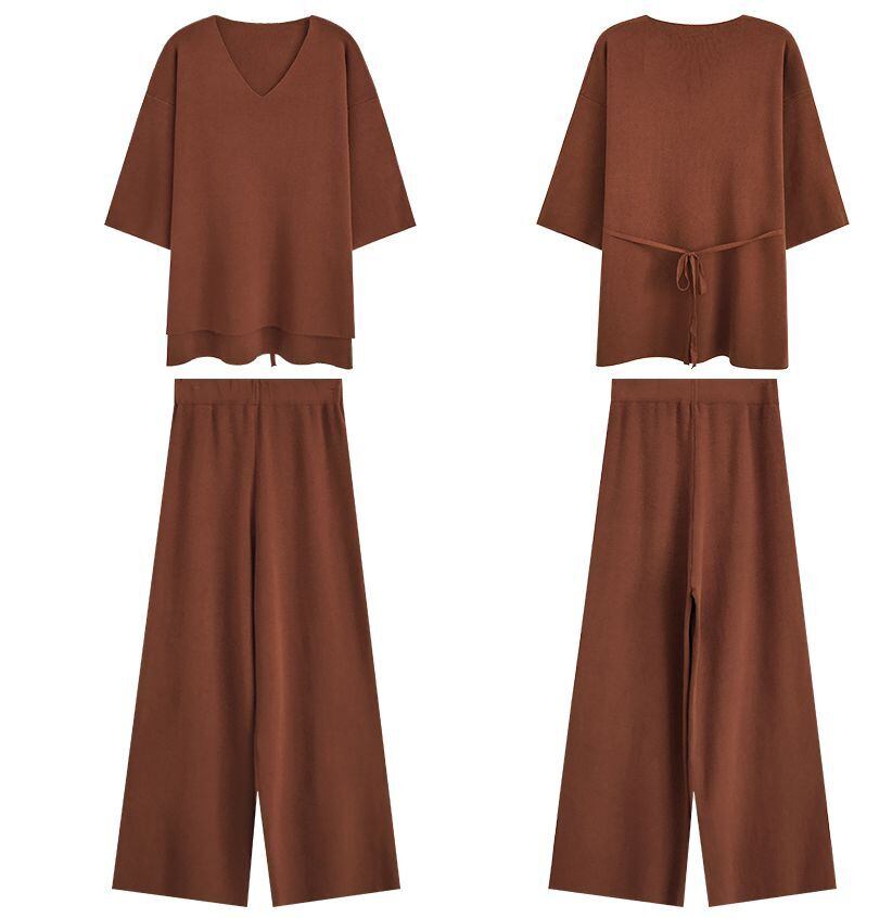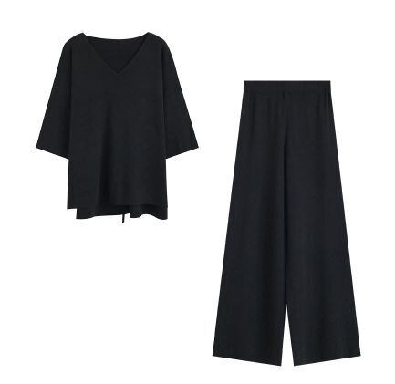 Vネック5分袖のプルオーバートップスに、ワイドレッグパンツのセットアップ♪