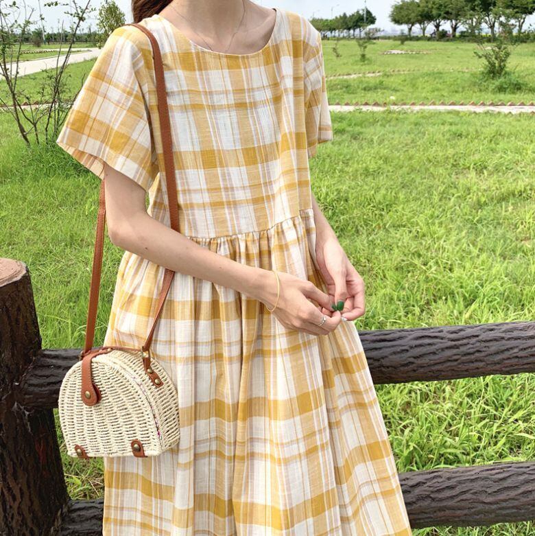 チェック柄半袖ワンピース ワンピース 5825 フレアワンピース ミモレ ミモレ丈 ロング ロング丈 袖あり 半袖 ラウンドネック フレア 切り替えデザイン 切り替えデザイン 綿 ポリエステル かわいい 大人可愛い シンプル カジュアル 大人 おしゃれ お洒落 大人可愛い 大人女子 こなれ感 ラフ ラブリー キュート ガーリー 主役級 存在感 柄 チェック柄 春 夏 10代 20代 30代 レディース 学生 通学 デート お出かけ 女子会 休日 着回し 重ね着 韓国 韓国系 黄色 イエロー 送料無料
