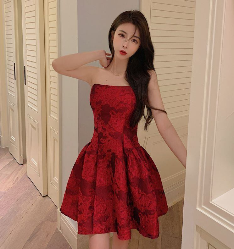 ワンピース ドレス ショート丈 袖なし 5054 ノースリーブ オフショルダー 襟なし フレア ハイウエスト かわいい 大人可愛い 上品 おしゃれ 大人可愛い 大人女子 ラブリー セクシー エレガント 主役級 パターン柄 オールシーズン 結婚式 二次会 披露宴 2021 10代 20代 レディース パーティー イベント ホテル レストラン 韓国系 スタイル モテ 脚長 新作 インスタ映え サイズ S M レッド 送料無料