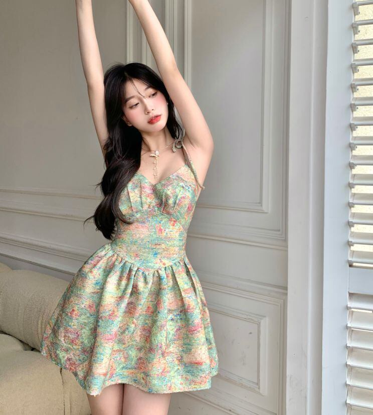 ワンピース ショート丈 袖なし 5061 ノースリーブ Vネック 襟なし Aライン ハイウエスト かわいい 大人可愛い おしゃれ レトロ 大人可愛い 大人女子 ラブリー キュート ガーリー セクシー パターン柄 夏 秋 2021 10代 20代 レディース デート お出かけ 女子会 休日 パーティー イベント リゾート 着回し 普段使い 韓国系 ファッション モテ 脚長 新作 トレンド インスタ映え サイズ S M エメラルド 送料無料