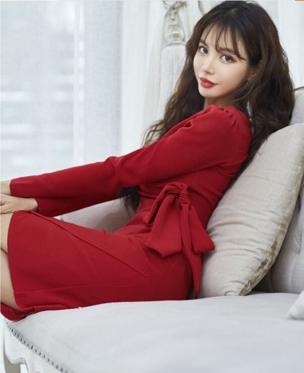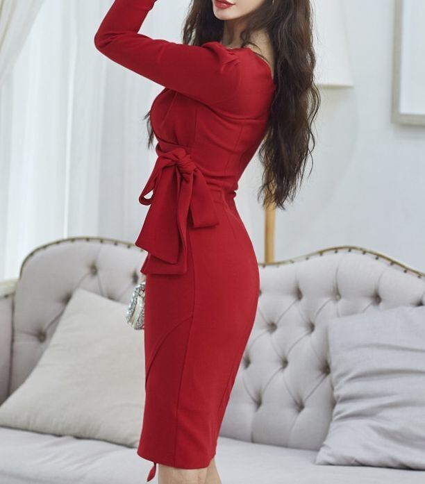 情熱のレッドカラーが圧倒的な存在感を誇る、カシュクール長袖ワンピース♪