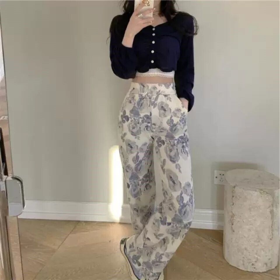 ボトムス ワイドパンツ アンクル丈 5093 ストレート ワイド ハイウエスト かわいい 大人可愛い かっこいい 大人可愛い 大人女子 ラフ ルーズ クール 花柄 春 夏 10代 20代 デート お出かけ 女子会 休日 普段使い 重ね着 韓国系 ファッション モテ プチプラ インスタ映え サイズ S M L XL 2XL ホワイト 送料無料