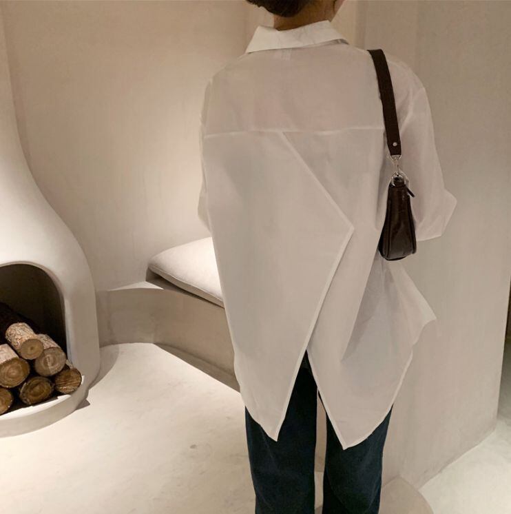 バックスリットが個性的な、ホワイトシャツです。フロントはレギュラーシャツのデザインで、ボトムスにインしたり出したまま着崩したりと自由なスタイルを楽しむことが出来ます。