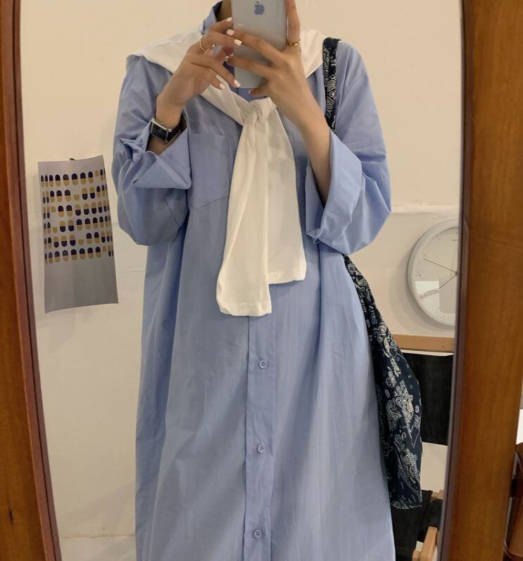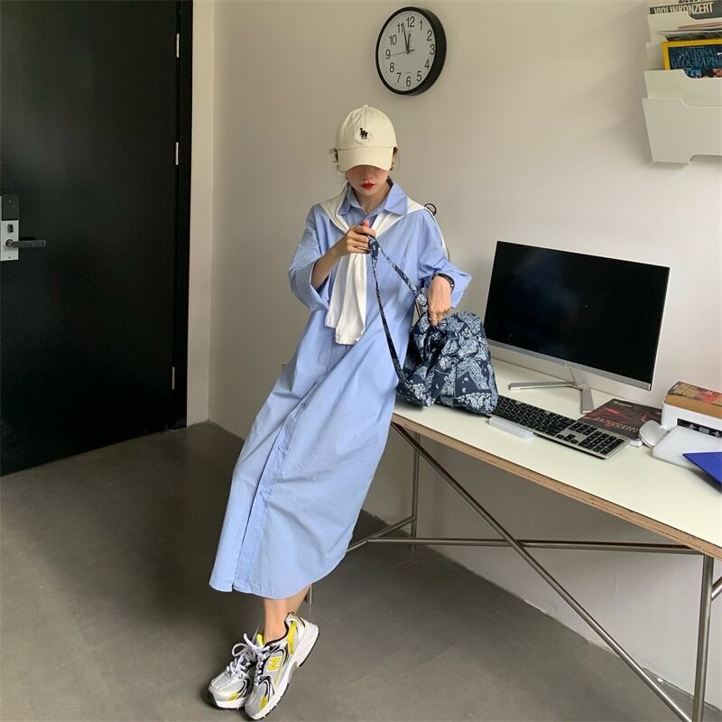 ワンピース シャツワンピース アンクル丈 袖あり 5118 長袖 襟付き POLO襟 ストレート ショール かわいい 大人可愛い シンプル カジュアル おしゃれ 大人可愛い こなれ感 ラフ ガーリー ルーズ 無地 春 秋 2021 10代 20代 レディース デート お出かけ 女子会 休日 旅行 着回し 普段使い 韓国系 ファッション 楽ちん 体系カバー 新作 インスタ映え S M L XL 2XL ライトブルー 送料無料