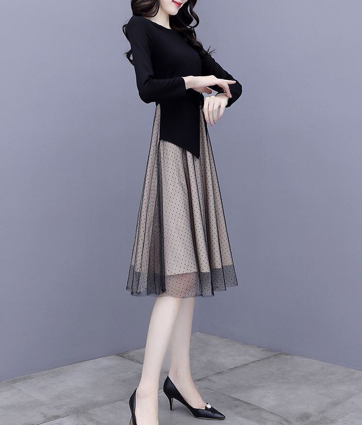 ワンピース ワンピドレス 膝丈 袖あり 5173 長袖 ラウンドネック 襟付き セミフレア Aライン アシンメトリー チュール ベルト ウエストマーク 切り替えデザイン ニット 大人可愛い きれいめ 上品 おしゃれ 大人女子 キュート エレガント ドット柄 秋 冬 2021 20代 30代 レディース デート お出かけ 女子会 休日 パーティー ホテル レストラン 着回し 普段使い オルチャン ファッション モテ 美脚 新作 インスタ映え サイズ S M L XL 2XL ブラック 秋カラー 送料無料