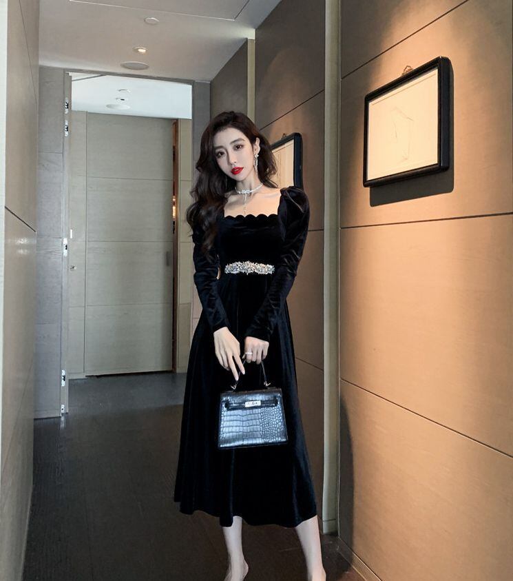 ワンピース ドレス ミモレ丈 袖あり 5203 長袖 襟付き スクエアカラー Aライン ウエストマーク ビジュー ベロア 大人可愛い きれいめ 大人 上品 おしゃれ レトロ 大人女子 セクシー エレガント 無地 秋 冬 2021 20代 30代 レディース デート パーティー イベント ホテル レストラン 着回し 韓国系 ファッション モテ 定番 インスタ映え サイズ S M L XL 2XL ブラック 送料無料