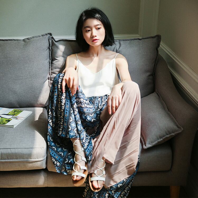 夏はノースリーブトップスやブラウスなどできれいめに、秋にはロングスリーブカットソーやスウェット、ニットを合わせてカジュアルに◎